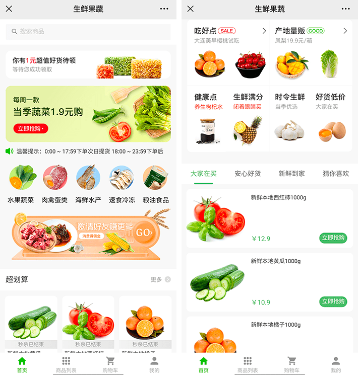 1. 商品展示和搜索:展示生鮮食品的照片,價(jià)格和詳細(xì)信息,并提供搜索引擎方便用戶查找所需產(chǎn)品。
